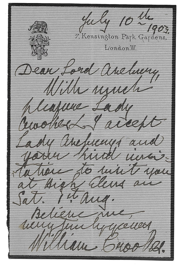 CROOKES, Sir William (1832-1919) Physicist, chemist and inventor. Discovered thalium (1861). During 1875 he invented the radiometer. His Crookes tubes were superior to the tubes with a cathode and anode. With his tubes he discovered the basic properties of the electric charge or cathode ray. Nominated for the 1906 Nobel Prize. Autograph letter signed ‘William Crookes’ ,7, Kensington Park Gardens, London W, July 10, 1903, to Lord Avebury. Crookes writes in part: “With much pleasure Lady Crookes and I accept Lady Avebury’s and your kind invitation to visit you at High Elens...".......................$195.00