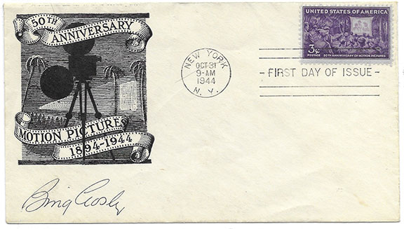 CROSBY, Bing (1903-1977). American singer, actor, the first multi-media star and one of the most popular and influential musical artists of the 20th century. He was the #1 box office attraction for 5 consecutive years, and he has 3 Stars on the Hollywood Walk of Fame. He won an Academy Award for Best Actor in Going My Way in 1944. First Day of Issue cover commemorating the 50th Anniversary of Motion Pictures. Fine cachet on an old movie camera and affixed to this cover is a US 3 cent 50th Anniversary of Motion Pictures postage stamp cancelled First Day of Issue, New York OCT 31, 1944. Hand signed with his desirable full signature, Bing Crosby, the same year he won the Academy Award. In fine condition................$225.00