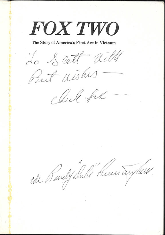 CUNNINGHAM, Randy “Duke” (1941- ). USN pilot, retired as Commander, Republican politician and a convicted felon. First American Ace in the Viet Nam War (5 victories). First to make kills with missiles. Went to Congress as a hero, left in 2005 as a disgraced felon. Brent Wilkes a defense contractor gave Cunningham $700,000 in perks including a submachine gun shooting lessons and the services of prostitutes. In return Wilkes got $87 million dollars in pentagon contracts. At the time Cunningham received the longest prison sentence (8 years for taking bribes) ever given to a member of Congress. His book: Fox Two.” Champlin Fighter Museum, 1984, softcover, one hundred sixty-one pages, excellent illustrations. Inscribed and signed from a former owner and signed with a five inch signature: “Cdr Randy Duke Cunningham” on the title page. In V/G condition..............................$35.00