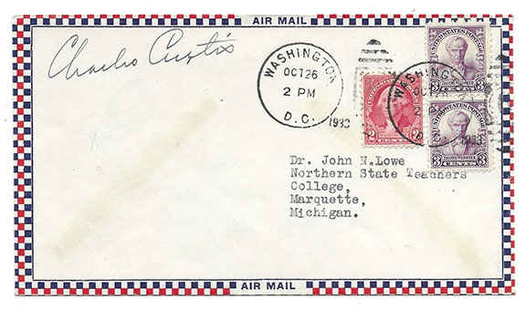 CURTIS, Charles (1860-1936). 31st Vice-President of the United States. First native American to reach the high office of Vice-President. U.S. Air Mail cover bearing 3 U.S. Postage Stamps, with a large circular postal cancellation, Washington Oct.26 D.C. 1933. Signed in the top upper left corner “Charles Curtis.”.................$85.00 |
