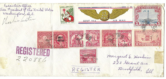 CURTIS, Charles (1860-1936). 31st Vice-President of the U.S. He was born in a territory not a State. At the time he was the highest-ranking Native America who served in the Federal Government until Kamala Harris. He was the first V/P to open the Olympic Games. Fantastic legal-size cover sent as Air Mail and Registered Mail. Affixed are 9 U.S. postage stamps cancelled. On the verso are 4 cancellation stamps starting with Washington, DC Dec. 30. 1930. Addressed in ink in a secretary’s hand along with writing the return address as “Executive Office, Vice President of the United States Washington, D.C. Below the return address, Curtis has signed his name in full. Most unusual. In V/G/ condition but for a few mounting traces on the verso..................$175.00