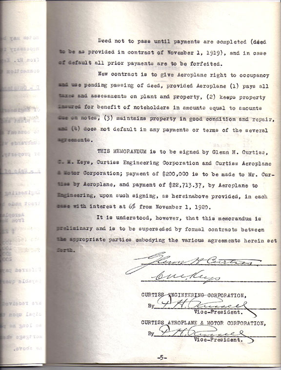 CURTISS, Glenn (1878-1930). American aviator and inventor. He set motorcycle speed records and won a trophy for the first public airplane flight of a kilometer in the U.S. (1908). He demonstrated the first practical seaplane and he developed the “Jenny”. Curtiss opened the first flying school in the U.S. He built the first heavier-than-air flying craft intended for transatlantic flight. He built over 5,000 planes for military use during WWI. He developed the Wasp, Navy Curtiss (NC) flying boat that made the first Atlantic crossing (1919). Curtiss is called the Father of U.S. naval aviation. He received the Aero Club of America’s first U.S. Pilot’s license #1. Document signed, 6 pages: “Glenn H. Curtiss, C.M. Keyes, Curtiss Engineering Corporation and Curtiss Aeroplane & Motor Corporation” December 13, 1920. This Memorandum list all the Securities Outstanding and the Assets for Curtiss Engineering Corporation. Plan: Mr. Curtiss to sell to Aeroplane and Aeroplane to buy from Mr. Curtiss $400,000 preferred stock etc. A total of 5pages of agreements including Aeroplane to purchase the plant for $662,713,37 and listing the payment plan. Memorandum signed by Glenn H. Curtiss and C.M. Keyes and also by the Vice-President of Curtiss Engineering Corporation and the Vice-President of Curtiss Aeroplane & Motor Corporation. In excellent condition.................SOLD