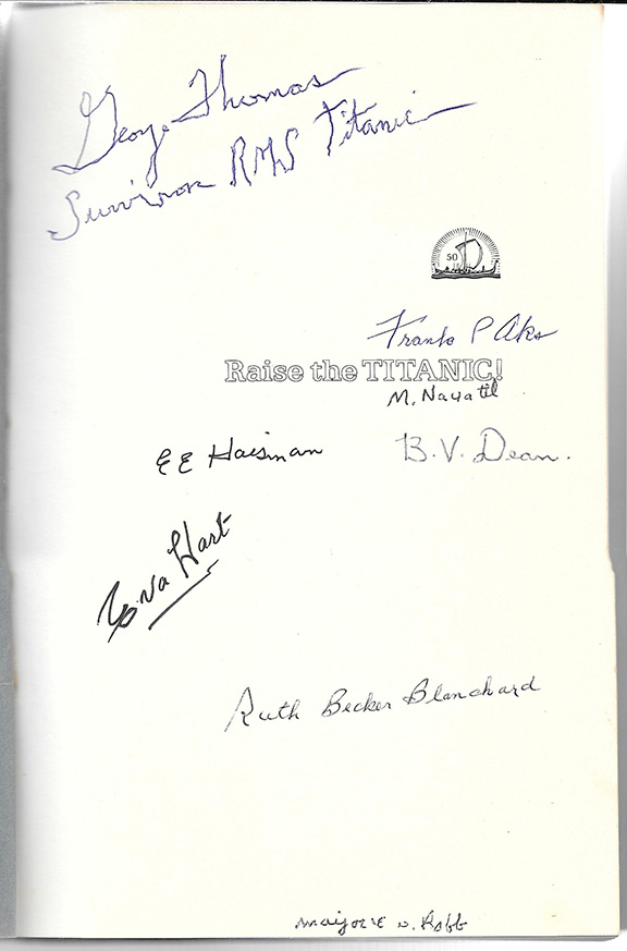 CUSSLER, Clive (1931- ) American adventure novelist and marine archaeologist. His book: “Raise the Titanic”. The Viking Press, 1976, first edition. Three hundred-fourteen pages, Signed by eight surviving passengers of the sinking of the Titanic. Those who have signed are: George Thomas who adds “Survivor R.M.S. Titanic”, Frank P. Aks, M. Navatil, E.E. Haisman, B.V. Dean, Eva Hart, Ruth Becker Blanchard and Marjorie N. Robb. A fine assemblage of names. In very good condition with the dust jacket...........................SOLD