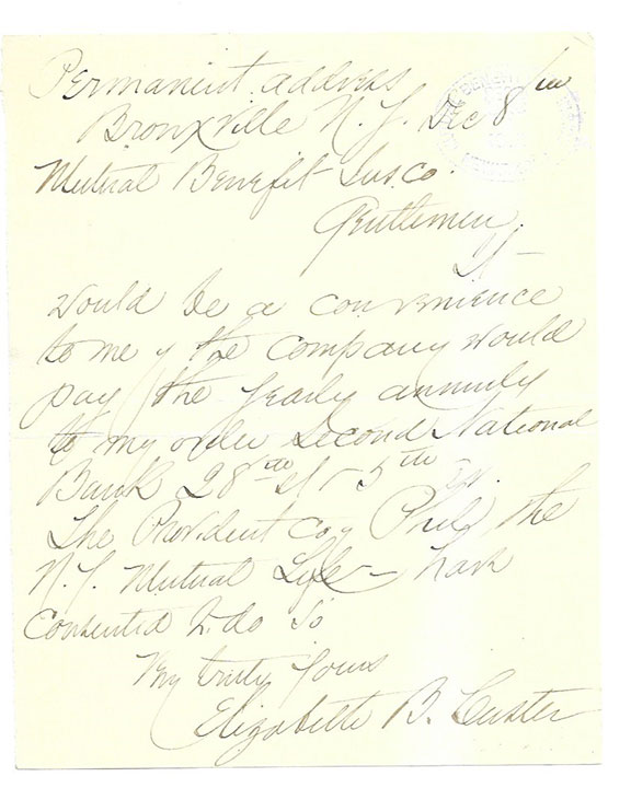 CUSTER, Elizabeth B. (1842-1933). American author, wife of Brevet Major General George A. Custer, most famous widow of the Indian Wars. Despite his numerous military campaigns in the Civil War and on the great plains as commanding officer of the U.S. Cavalry she spent most of her time with him. She has been portrayed by a number of actresses in1940’s films including Olivia de Havilland in “They Died with their Boots On.” Autograph letter signed, one full page, she writes: “Permanent address, Bronxville, N.Y. Dec.8th, Mutual Benefit Ins. Co., Gentlemen, It would be a convenience to me if the company would pay the yearly annually to my order Second National Bank 28th & 5th Av The Provident Co…Very truly yours, Elizabeth B. Custer.” In very fine condition. Together with a nice postcard portrait of Elizabeth Custer. Nice pair for framing............$550.00