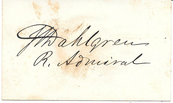 DAHLGREN,  J. A. (1809-1879).  Union Admiral and inventor of the Dahlgren Gun.  Signature adding in his hand “R. Admiral.”  Nice margins, scattered light browning otherwise in very good condition..........................$165.00