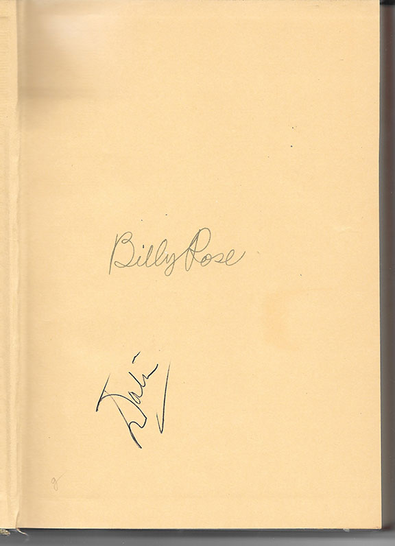 Rose’s book “Wine, Women and Words.” Simon & Schuster, 1948, First Edition. Illustrated by Salvador Dali. Two hundred ninety-five pages, heavily illustrated. Signed by Billy Rose and by Salvador Dali. Dali’s signature was obtained in person at the St. Regis Hotel in November 1986 at a time when his signature was starting to show signs of age and deterioration. Book in very good condition. Very scarce to be signed by both..............................SOLD