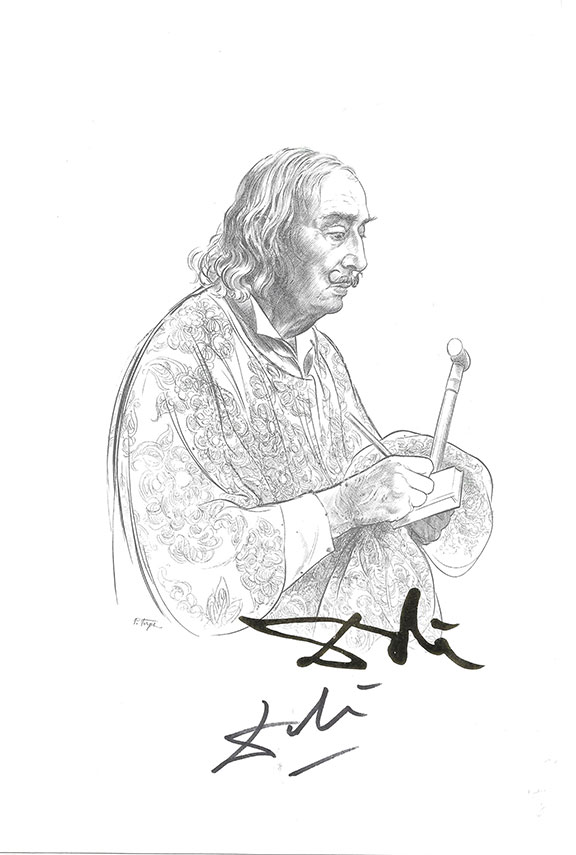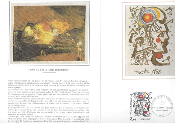 DALI, Salvador (1904-1989). Spanish surrealist painter. Best known for his striking and bizarre images. Scarce and a very attractive 4 page folder with a portrait of Dali on the cover. When opened, inside on both panels are copies of Dali’s works printed on silk. Under one of the portraits is a French postage stamp of the same works cancelled Paris, 17 Novembre 1979. On the rear cover is printed “Exemplaire No 02777.” On the front cover bears Dali’s signature printed in gold. Below Dali has signed his name “in person” in the lobby of the St. Regis Hotel in New York City in 1983. In very fine condition ..................................$425.00