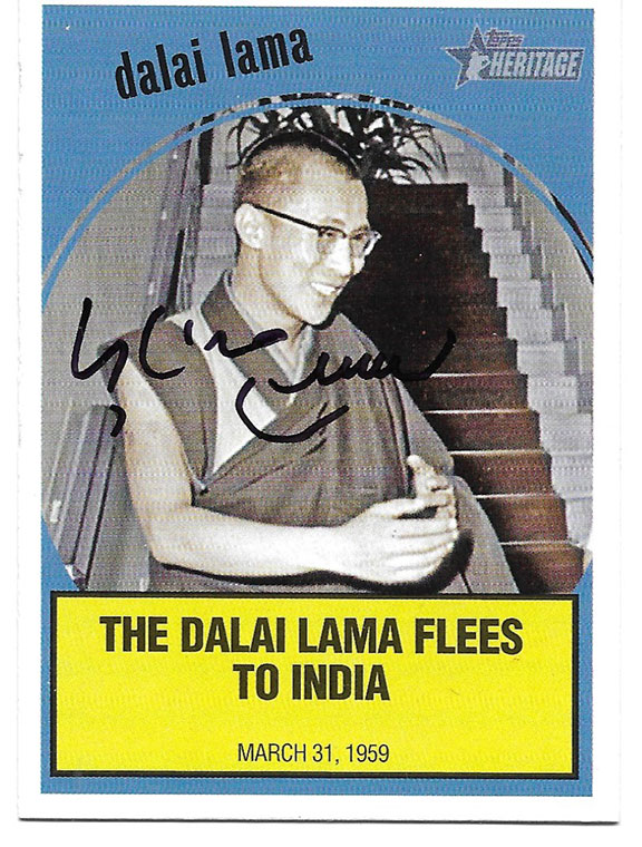 DALI LAMA XIV (1935- ) (Tenzin Gyatso). Tibetan religious leader. In 1939 he was recognized as the 14th Dalai Lama in a public declaration. During the 1959 Tibetan uprising he fled to India where he currently lives as a refugee. He is the recipient of the Nobel Peace Prize (1989). In 1996 the Chinese Communist Party reinstated the total prohibition of any photograph of the 14th Dalai Lama. Authorities in Tibet have banned photographs in public places and monasteries. Plain clothes policemen went to hotels and restaurants and ordered all pictures of the Dalai Lama to be removed. His current net worth is $150 million. Topps Heritage Trading card, 2008, The Dalai Lama Flees To India. Color portrait of a smiling Dalai Lama, March 31, 1959. Boldy signed using a black ink pen. Fine contrast and in V/G to Fine condition. These cards signed are near impossible to find. Last one sold on eBay for $2500.00. Our price..........................$450.00