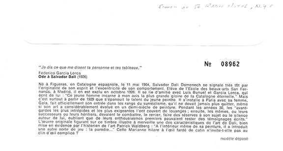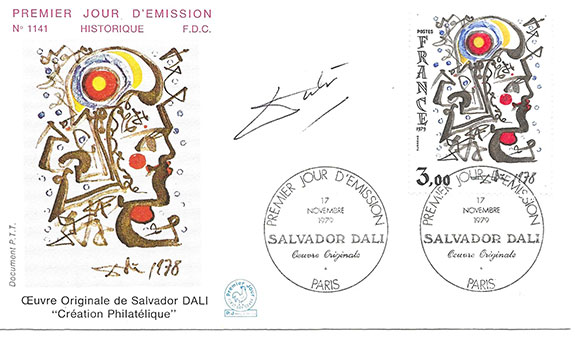 DALI, Salvador (1904-1989). Spanish surrealist painter. Best known for his striking and bizarre images. Scarce and attractive color First Day Cover commemorating a new Salvador Dali creation. Affixed is a fabulous French stamp in color of the same illustration on the cover. Two cancellations “Premier Jour D’Emission, 17 November 1979 Salvador Dali Oeuvre Originals Paris.” In person, hand signed “Dali” at the St. Regis Hotel in New York City. In fine condition and perfect for framing..........$375.00