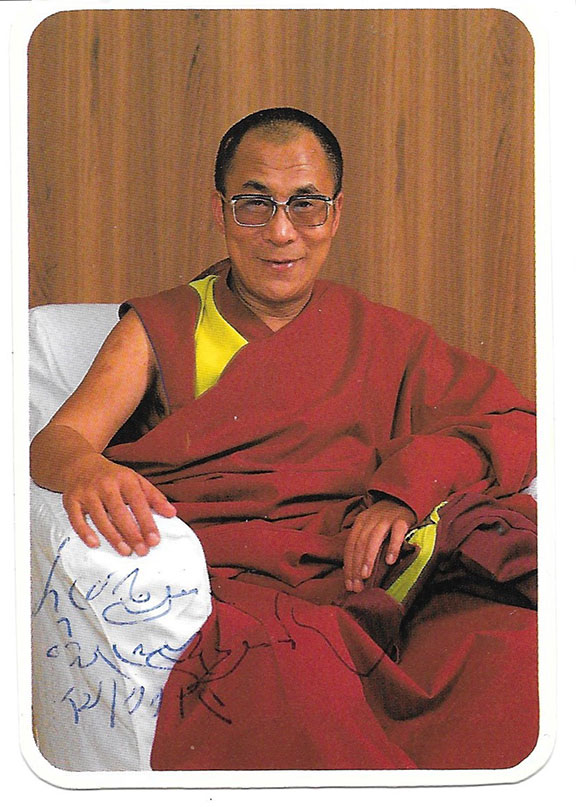 DALI LAMA XIV (1935- ) (Tenzin Gyatso). Tibetan religious leader. In 1939 he was recognized as the 14th Dalai Lama in a public declaration. During the 1959 Tibetan uprising he fled to India where he currently lives as a refugee. He is the recipient of the Nobel Peace Prize (1989). In 1996 the Chinese Communist Party reinstated the total prohibition of any photograph of the 14th Dalai Lama. Authorities in Tibet have banned photographs in public places and monasteries. Plain clothes policemen went to hotels and restaurants and ordered all pictures of the Dalai Lama to be removed. Fabulous color photograph of the Dalai Lama, smiling, three quarters pose, sitting in a chair. Measures appx. 2.5”x4”. He has signed his name adding a sentiment and date. According to the verso it appears this photo was signed in 1988. Rather exceptional with the extra writing and date in his hand. In excellent condition..........................SOLD