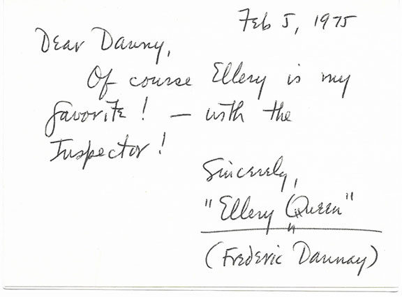 DANNAY, Frederic (1905-1982). American author, co-author of more than 35 Ellery Queen detective novels. Creator of Ellery Queen. Ellery Queen was a fictional character and pseudonym used by Dannay. He sold more than 100 million books worldwide. Interesting autograph letter signed on a approx. 4”x5” card. Feb.5, 1975, he writes “Dear Danny, Of course Ellery is my favorite! – with the Inspector! Sincerely, Ellery Queen (Frederic Dannay.” Anything signed by Dannay can be considered scarce and this has nice content and signed with a double signature. Mint condition.........$295.00