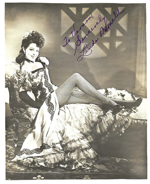 DARNELL, Linda (1923-1965). Child model, American film actress. Her first film was in 1939, Co-starred with Tyrone Power. She hid her young age from the studios. Her true age came out in 1939. She was plagued with extortion letters but she was protected by the F.B.I. Died from burns in a house fire. Her body was held in storage for ten years, Photograph, borderless 7”x9” very leggy pose, full length dressed in a Victorian dress sitting on a couch. She is looking directly into the camera and smiling. Inscribed and signed: “To Vernon, Sincerely Linda Darnell.” In fine condition........$250.00
