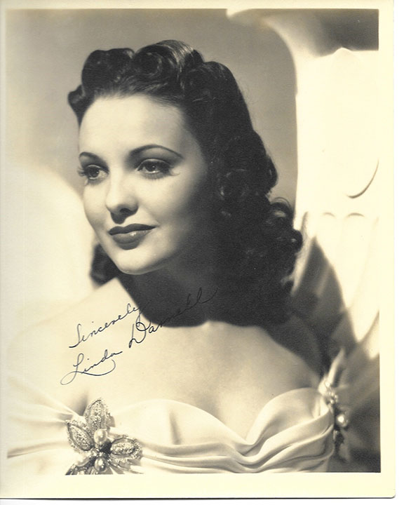 DARNELL, Linda (1923-1965). Child model, American film actress. Her first film was in 1939, Co-starred with Tyrone Power. She hid her young age from the studios. Her true age came out in 1939. She was plagued with extortion letters but she was protected by the F.B.I. Died from burns in a house fire. Her body was held in storage for ten years, Photograph, 8”x10” Bust pose smiling. Signed with a one word sentiment: “Sincerely Linda Darnell.” In fine condition........$195.00![]() |