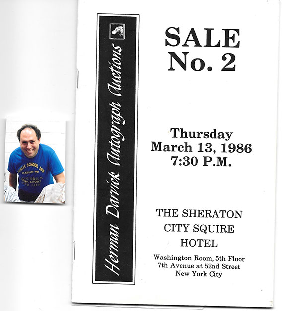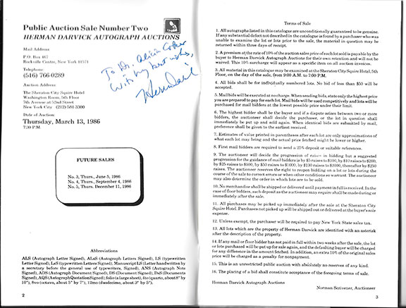 Herman Darvick Autograph Auctions, Sale #2, March 13, 1986 Catalog. 48 pages. Inscribed and signed by Herman Darvick to a doctor on the inside front cover. Together with a small color photograph of Herman Darvick. Signatures of autograph forgers are quite scarce and somewhat desirable. Many of the forged signatures of Lincoln become available from time to time but the signatures of the forgers themselves are quite scarce. Signatures of forgers are collectable such as Joseph Cosey, Eugene Field II, Charles Weisberg, Henry Cleveland, John Laffite, Harry Sickles and Henry Woodhouse but are very difficult to obtain. Signatures of the Mormon Forger Mark W. Hoffman are very desirable and costly........$30.00