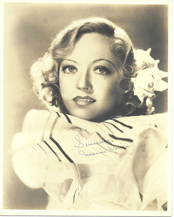 DAVIES, Marion (1897-1961). American film actress. Her first film was in 1917 and her last in 1937. Mistress of William Randolph Hearst. Matte finish photograph, 8’’x10”, bust pose smiling. Signed with a one-word sentiment: “Sincerely Marion Davies.” Scarce when not inscribed. In fine condition...........................$175.00![]() |