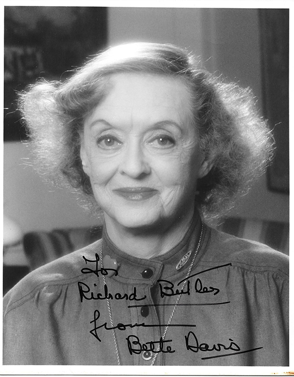 DAVIS, Bette (1908-1980). American dramatic actress, box office Queen. Photograph, 8”x10”, B&W, head & shoulders pose looking directly into the camera. Inscribed and signed: “For Richard Butler, from Bette Davis”. Fine condition...........................$100.00![]() |