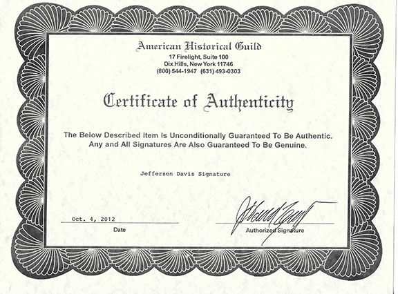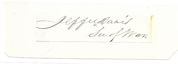DAVIS, Jefferson (1808-1889). Graduate of West Point and served in the Mexican War. Entering politics, he campaigned for a successful presidential candidate Franklin Pierce. For this he was rewarded with the cabinet post of Secretary of War. 23rd Secretary of War (1853-1857). President of the Confederate States of America. Signature on a slip “Jeffn. Davis” adding in his hand “Sec of War.” Not common in this form. Together with a COA from American Historical Guild. In fine condition.........$575.00