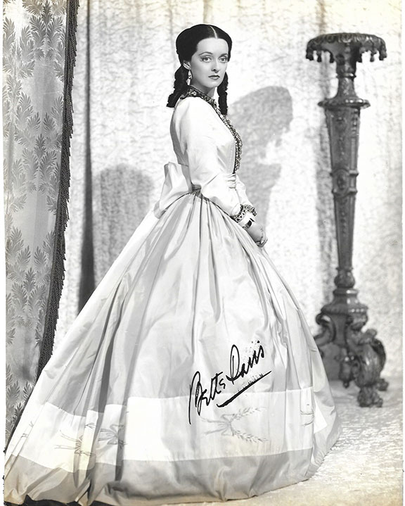 DAVIS, Bette (1908-1989). American actress of film, television and theater. Her career spanned 60 years. First person to earn five consecutive Academy Award nominations. Vintage photograph, B&W, 7”x9”, full length elegant pose, wearing a richly embroidered gown and looking quite serious. A scene from Juarez, boldly signed. Some mounting traces on the verso otherwise in fine condition.................................$195.00![]() |