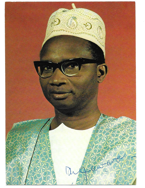 DAWDA, Sir Jawara (1924-2019). First Prime Minister of Gambia (1962-1970), First President of Gambia (1970-1994). He gained Independence from the UK in 1965, Queen Elizabeth II was Head of State. In 1994, there was a coup d’état and Dawda went into exile later to return. Very uncommon color photograph,4”x6”, head and shoulders pose, signed.............................$125.00