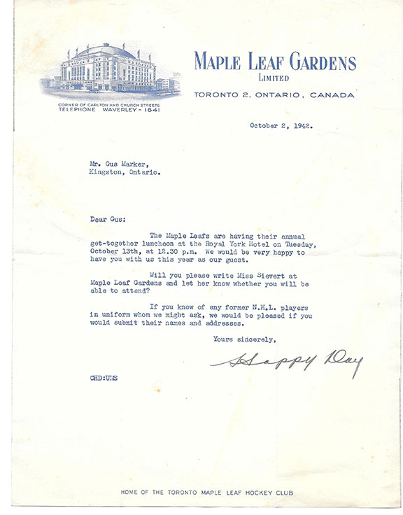 DAY, Happy (1901-1990). Canadian professional hockey player. He played 14 seasons for the National Hockey League for the Toronto Maple leafs and the New York Americans. He was inducted into the Hockey Hall of Fame in 1961. Uncommon typed letter signed on the ornate letterhead of Maple Leaf Gardens. October 2, 1948. He is inviting a friend to attend the annual meeting of the Maple Leafs. Boldly signed..............$275.00![]() |