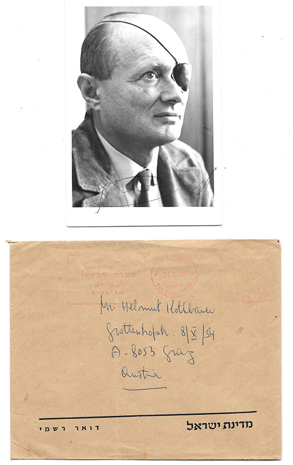 DAYAN, Moshe (1915-1981). Israeli military leader, Commander of the Six Day War (1969). Chief of staff (1953-58), Minister of Agriculture, Defense and Foreign Affairs. Photograph, 3.5”x5”, B&W, close up head & shoulders pose wearing his eye patch. Signed in Hebrew. Together with the original envelope. Photographs with a genuine signature are becoming quite uncommon. A fine example.................$250.00![]() |