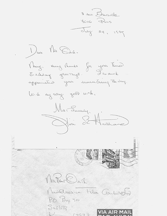 de HAVILLAND, Olivia (1916 Tokyo- 2020 Paris). French-British-American actress. She was popular from 1935 to 1988. She appeared in 49 featured films and was one of the leading actresses of her time. Her best-known role was as “Melanie Hamilton” in Gone With the Wind (1939). She received 5 Oscar nominations She dated Howard Hughes who gave the actress her first flying lesson. She also had a relationship with Jimmy Stewart. She became interested in politics and campaigned for FDR’s re-election in 1944. Olivia de Havilland and her sister Joan Fontaine are the only siblings to have won an Academy Award in a lead acting category. Uncommon autograph letter signed, one full page, Paris, July 24, 1979 to Dear Mr. Orth. She writes: “Many, many thanks for your kind birthday greetings. I so much appreciated your remembering the day. With my every good wish, Most Sincerely.” Wonderful signature together with her hand addressed envelope.................$125.00