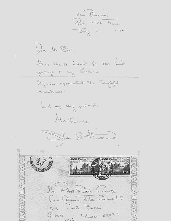 de HAVILLAND, Olivia (1916 Tokyo- 2020 Paris). French-British-American actress. She was popular from 1935 to 1988. She appeared in 49 featured films and was one of the leading actresses of her time. Her best-known role was as “Melanie Hamilton” in Gone With the Wind (1939). She received 5 Oscar nominations She dated Howard Hughes who gave the actress her first flying lesson. She also had a relationship with Jimmy Stewart. She became interested in politics and campaigned for FDR’s re-election in 1944. Olivia de Havilland and her sister Joan Fontaine are the only siblings to have won an Academy Award in a lead acting category. Uncommon autograph letter signed, one full page, Paris, July 21, 1977 to Dear Mr. Orth. She writes: “Many thanks indeed for your kind greeting on my birthday. I greatly appreciated this thoughtful remembrance. With my very good wish, Most Sincerely.” Very nice signature together with the original attractive envelope.................$125.00