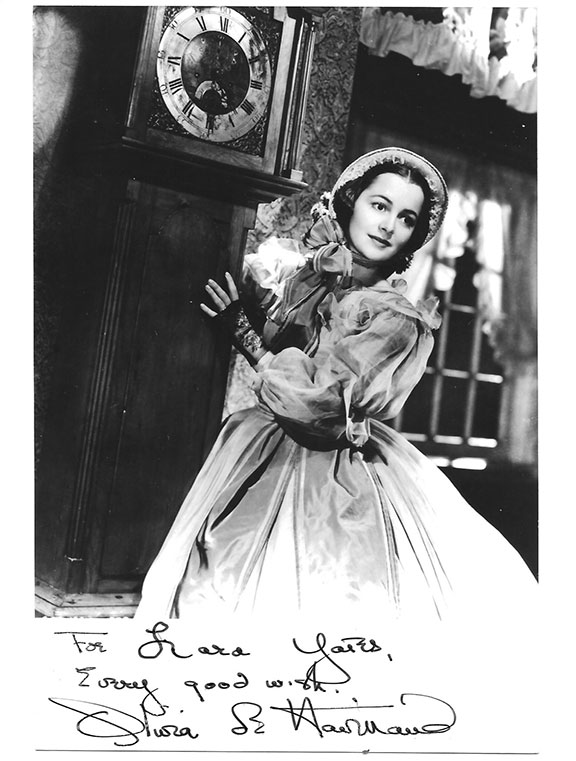 de HAVILLAND, Olivia (1916 Tokyo- 2020 Paris). French-British-American actress. She was popular from 1935 to 1988. She appeared in 49 featured films and was one of the leading actresses of her time. Her best-known role was as “Melanie Hamilton” in Gone With the Wind (1939). She received 5 Oscar nominations She dated Howard Hughes who gave the actress her first flying lesson. She also had a relationship with Jimmy Stewart. She became interested in politics and campaigned for FDR’s re-election in 1944. Olivia de Havilland and her sister Joan Fontaine are the only siblings to have won an Academy Award in a lead acting category. Photograph, B&W, 4”x6” of Olivia as Melanie Hamilton in Gone With the Wind. Inscribed and signed on the lower white margin: “For Lara Yates, every good wish, Olivia de Havilland.” Very fine condition.................$125.00