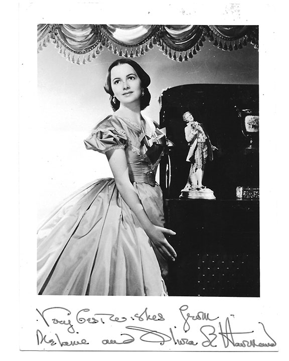 de HAVILLAND, Olivia (1916 Tokyo- 2020 Paris). French-British-American actress. She was popular from 1935 to 1988. She appeared in 49 featured films and was one of the leading actresses of her time. Her best-known role was as “Melanie Hamilton” in Gone With the Wind (1939). She received 5 Oscar nominations She dated Howard Hughes who gave the actress her first flying lesson. She also had a relationship with Jimmy Stewart. She became interested in politics and campaigned for FDR’s re-election in 1944. Olivia de Havilland and her sister Joan Fontaine are the only siblings to have won an Academy Award in a lead acting category. Photograph, B&W, 3.5”x5” of Olivia from Gone With the Wind. Choice sentiment and signature: “Very best wishes from Melanie and Olivia de Havilland.” Very fine condition.................SOLD