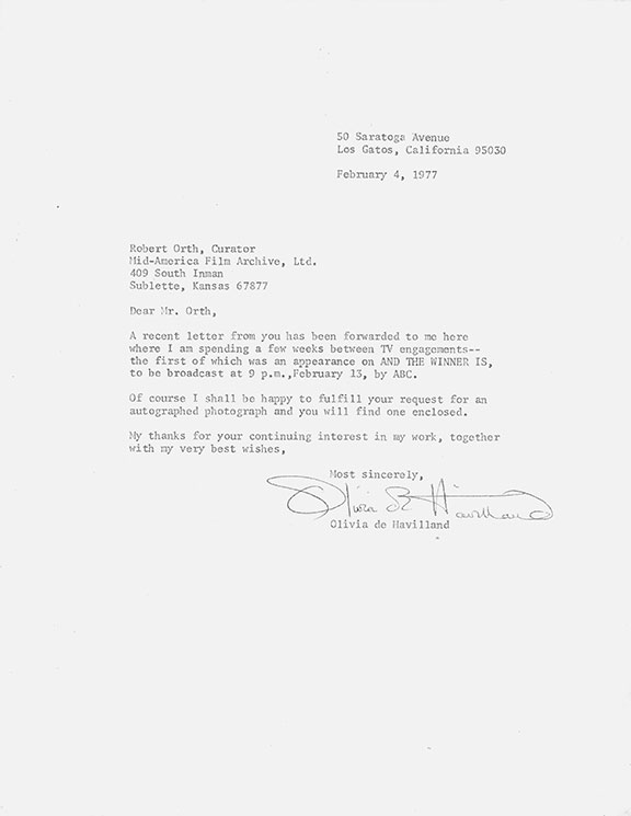 de HAVILLAND, Olivia (1916 Tokyo- 2020 Paris). French-British-American actress. She was popular from 1935 to 1988. She appeared in 49 featured films and was one of the leading actresses of her time. Her best-known role was as “Melanie Hamilton” in Gone With the Wind (1939). She received 5 Oscar nominations She dated Howard Hughes who gave the actress her first flying lesson. She also had a relationship with Jimmy Stewart. She became interested in politics and campaigned for FDR’s re-election in 1944. Olivia de Havilland and her sister Joan Fontaine are the only siblings to have won an Academy Award in a lead acting category. Typed letter signed, one page, Los Gatos, Calif. February 4, 1977. To Robert Orth, Curator of American Film Archives. Nice content letter in part: “....forwarded to me here where I am spending a few weeks between TV engagements—the first of which was an appearance on AND THE WINNER IS, to be broadcast at 9 p.m., February 13, by ABC.” Signed in full and in very fine condition.................$75.00