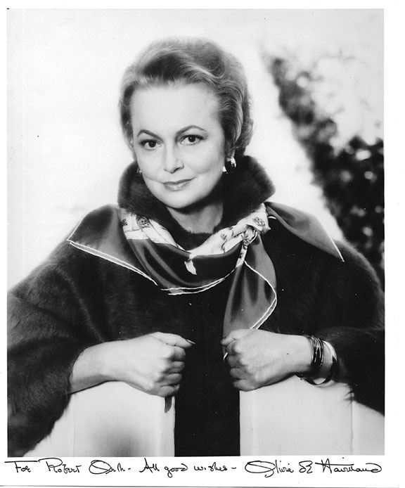 de HAVILLAND, Olivia (1916 Tokyo- 2020 Paris). French-British-American actress. She was popular from 1935 to 1988. She appeared in 49 featured films and was one of the leading actresses of her time. Her best-known role was as “Melanie Hamilton” in Gone With the Wind (1939). She received 5 Oscar nominations She dated Howard Hughes who gave the actress her first flying lesson. She also had a relationship with Jimmy Stewart. She became interested in politics and campaigned for FDR’s re-election in 1944. Olivia de Havilland and her sister Joan Fontaine are the only siblings to have won an Academy Award in a lead acting category. Photograph, B&W, 8”x10” middle aged half-length pose looking directly into the camera. Inscribed and signed on the lower white margin: “For Robert Orth- All good wishes- Olivia de Havilland.” Fine condition...........$165.00