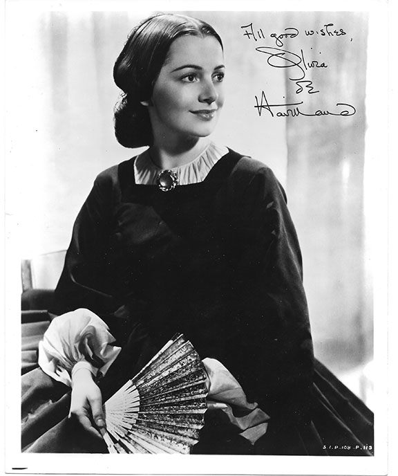 de HAVILLAND, Olivia (1916 Tokyo- 2020 Paris). French-British-American actress. She was popular from 1935 to 1988. She appeared in 49 featured films and was one of the leading actresses of her time. Her best-known role was as “Melanie Hamilton” in Gone With the Wind (1939). She received 5 Oscar nominations She dated Howard Hughes who gave the actress her first flying lesson. She also had a relationship with Jimmy Stewart. She became interested in politics and campaigned for FDR’s re-election in 1944. Olivia de Havilland and her sister Joan Fontaine are the only siblings to have won an Academy Award in a lead acting category. Photograph, B&W, 8”x10” of Olivia in Gone With the Wind. Looking slightly to her left, smiling, and holding a fan. Signed with a three-word sentiment. In very fine condition.................................SOLD
