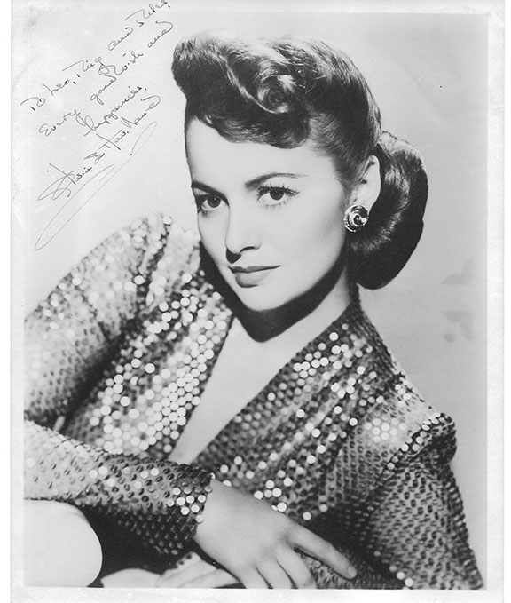 de HAVILLAND, Olivia (1916 Tokyo- 2020 Paris). French-British-American actress. She was popular from 1935 to 1988. She appeared in 49 featured films and was one of the leading actresses of her time. Her best-known role was as “Melanie Hamilton” in Gone With the Wind (1939). She received 5 Oscar nominations She dated Howard Hughes who gave the actress her first flying lesson. She also had a relationship with Jimmy Stewart. She became interested in politics and campaigned for FDR’s re-election in 1944. Olivia de Havilland and her sister Joan Fontaine are the only siblings to have won an Academy Award in a lead acting category. Photograph, Vintage, B&W, 8”x10” of Olivia half length pose looking quite serious and looking directly into the camera. Inscribed and signed: “To Leo, Bing, and Jules, Every good wish and happiness. Olivia de Havilland.” In fine condition.................................$175.00