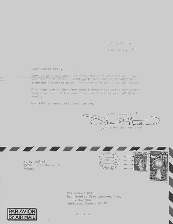 de HAVILLAND, Olivia (1916 Tokyo- 2020 Paris). French-British-American actress. She was popular from 1935 to 1988. She appeared in 49 featured films and was one of the leading actresses of her time. Her best-known role was as “Melanie Hamilton” in Gone With the Wind (1939). She received 5 Oscar nominations She dated Howard Hughes who gave the actress her first flying lesson. She also had a relationship with Jimmy Stewart. She became interested in politics and campaigned for FDR’s re-election in 1944. Olivia de Havilland and her sister Joan Fontaine are the only siblings to have won an Academy Award in a lead acting category. Typed letter signed, one page, Paris, France, January 29, 1982. To Robert Orth, Curator of American Film Archives. In part: “...Through some curious mischance, two very kind letters from you bearing birthday greetings in past years, as well as a charming Christmas card, have only just come into my hands....I regret the tardiness of this reply....” Choice signature. Together with the original envelope.................$75.00