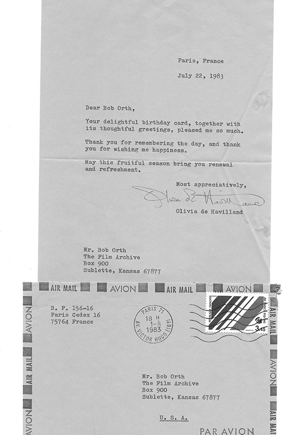 de HAVILLAND, Olivia (1916 Tokyo- 2020 Paris). French-British-American actress. She was popular from 1935 to 1988. She appeared in 49 featured films and was one of the leading actresses of her time. Her best-known role was as “Melanie Hamilton” in Gone With the Wind (1939). She received 5 Oscar nominations She dated Howard Hughes who gave the actress her first flying lesson. She also had a relationship with Jimmy Stewart. She became interested in politics and campaigned for FDR’s re-election in 1944. Olivia de Havilland and her sister Joan Fontaine are the only siblings to have won an Academy Award in a lead acting category. Typed letter signed, one page, Paris, France, July 22, 1983. To Robert Orth she writes in part: “Your delightful birthday card, together with its thoughtful greetings, pleased me so much. Thank you for remembering the day....may this fruitful season bring you renewal and refreshment.” Very good condition with original envelope.................$65.00