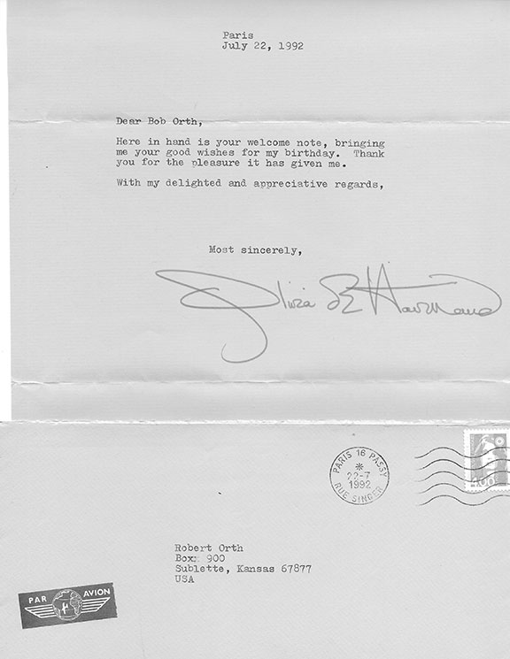 de HAVILLAND, Olivia (1916 Tokyo- 2020 Paris). French-British-American actress. She was popular from 1935 to 1988. She appeared in 49 featured films and was one of the leading actresses of her time. Her best-known role was as “Melanie Hamilton” in Gone With the Wind (1939). She received 5 Oscar nominations She dated Howard Hughes who gave the actress her first flying lesson. She also had a relationship with Jimmy Stewart. She became interested in politics and campaigned for FDR’s re-election in 1944. Olivia de Havilland and her sister Joan Fontaine are the only siblings to have won an Academy Award in a lead acting category. Typed letter signed, one page, Paris, France, July 22, 1992 to Bob Orth. A fine letter sending thanks for birthday wishes. Signed with a fabulous signature measuring five and a half inches long. Together with the original envelope.................$67.50