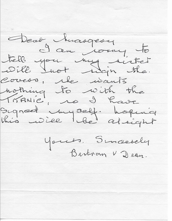 DEAN, B(ertram) V. (1910-1992). Third Class child passenger on the R.M.S. Titanic. Rescued by Lifeboat #13. Died on April 14, 1992, exactly 80 years to the day after the Titanic struck an iceberg. Choice letter signed, one page, no date, interesting content. The letter appears to be written by another but signed with an uncommon full signature of Bertram V. Dean. “Dear....I am sorry to tell you my sister will not sign the covers. She wants nothing to (do) with the Titanic, so I have signed myself. Hoping this will be alright, Yours Sincerely, Bertram V. Dean.” In fine condition.....................$145.00