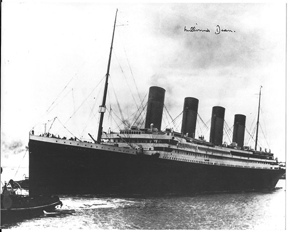 DEAN, Millvina (192-2009). British citizen, last surviving passenger of the R.M.S. Titanic. Some believe she was the youngest passenger aboard. In 2009 she was cremated and her ashes was scattered in Southampton, England. Photograph of the Titanic, 8”x10”, B&W, full length, hand signed by Millvina Dean in the light portion of the sky. Together with an original color photo of Millvina Dean taken in her home holding this photograph. A most unusual combination of Titanic collectibles. In excellent condition..........................$145.00