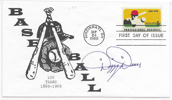 DEAN, Dizzy (1910-1974). Professional baseball player. Played for the St. Louis Cardinals, Chicago Cubs, and the St. Louis Browns. In 1953 he was inducted into the Baseball Hall of Fame. Later he became a well-known radio sports announcer. FDC commemorating the first 100 years of baseball. Cachet of crossed bats, with a glove, ball, and hat. Affixed is a US 6 cent Professional Baseball postage stamp cancelled First Day of Issue, Cincinnati, OH Sep 24, 1969. A fabulous hand signed signature of Dizzy Dean in the clear area of this cover. In very fine condition.....................$265.00