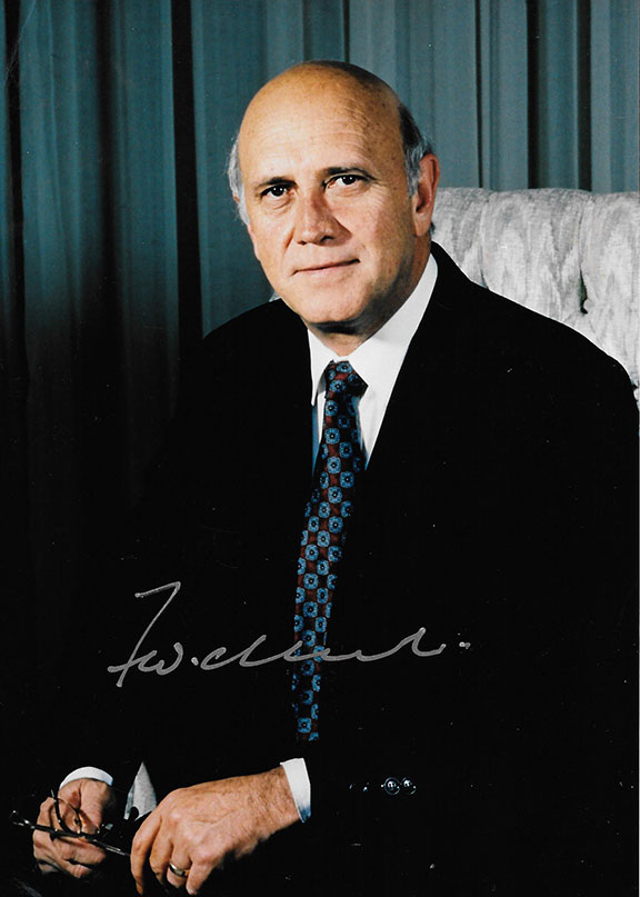 DE KLERK, Frederik Willem (1936- ) 7TH State President of South Africa (1989-1994). Along with Nelson Mandela he was awarded the 1993 Noble Peace Prize for his role in ending apartheid. Color photograph, 5”x7” half length pose. Signed using a silver ink pen. Excellent contrast...............................$75.00![]() |