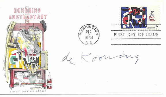 DeKOONING, Willem (1904-1997). Dutch Abstract Impressionist. He transformed the traditions of European art to create his own energetic and unconstrained style. First Day Cover commemorating Honoring Abstract Art. Colorful cachet of a busy easel. Affixed is a U.S. 5 cent Fine Arts postage stamp. Cancelled First Day of Issue Washington, D.C. DEC 2, 1964. A fine ink signature “de Kooning” in a light area of the cover. Quite uncommon and in fine condition.....................$350.00![]() |