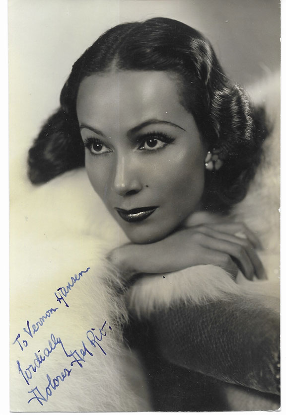 DEL RIO, Dolores (1905-1983). Mexican actress in silent movies, film, theatre and TV. Her career spanned over 50 years Vintage, photo, head and shoulders pose, shoulders wrapped in fur, 5”x7.5” D’Gaggeri Studio, Beverly Hills, California. Inscribed to Vernon Hansen, Cordially Dolores Del Rio.” In V/G-Fine condition.....................$75.00![]() |
