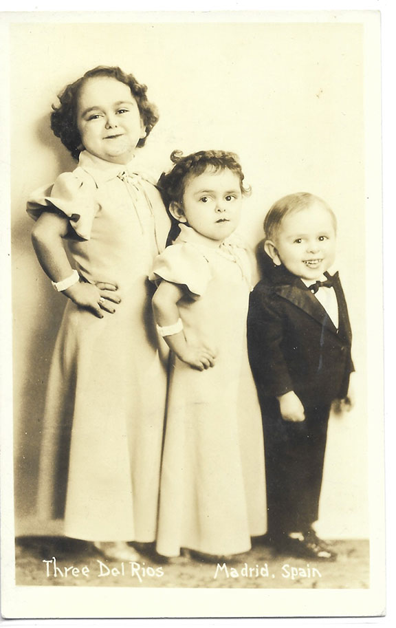 THE THREE DEL RIOS, Their career began in Mexico in the early 1930’s. During that time they were the most popular little people to appear before sideshow audiences. Trinidad, Dolores and Paul (Rodriguez) is said to journey to California to become munchkins in The Wizard of Oz. Paul was the smallest man in the world. Original postcard size photograph of the three hand signed in pencil on the verso. Signed images of the Del Rios are uncommon. In fine condition .............$75.00