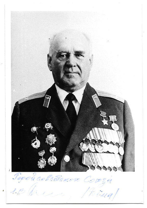 DEMA, Leonid (1916- ) Fighter pilot, U.S.S.R. Flew 273 flights, Ace credited with 17 victories and 5 in a group. Hero of the U.S.S.R. (1944). Photograph, B&W, 3.5”X5”, half length pose in uniform wearing a chest full of medals. Signed on the lower white margin adding a few words in Russian...............$175.00![]() |