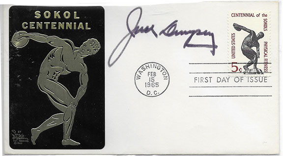 DEMPSEY, Jack (1895-1983). American professional boxer. He held the heavyweight championship for the years 1919 thru 1926. In 1950 the Associated press voted Dempsey the greatest boxer in 50 years. FDC commemorating the SOKOL Centennial. Affixed is a cachet of a disk thrower and affixed to this cover is a US 5 cent Physical Fitness postage stamp cancelled Washington DC, FEB 15, 1965. Boldly hand signed by Jack Dempsey. In fine condition.....................$125.00![]() |
