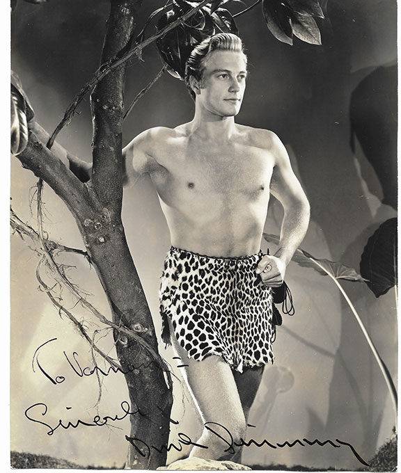 DENNING, Richard (1914-1998). American actor who starred in the science fiction films of the 50’s. Appeared in the Creature of the Black Lagoon, Target Earth, Day the World Ended, The Black Scorpion, Geronimo and Some Like It Hot. He played Lory’s husband on the CBS radio series My Favorite Husband (1948-1951). Handsome vintage 1940’s photograph, 7.5”x9”, B&W, three quarter shirtless pose dressed as Tarzan. Inscribed and signed using a fountain pen: “To Vernon- Sincerely, Dick Denning.” In fine condition.........SOLD