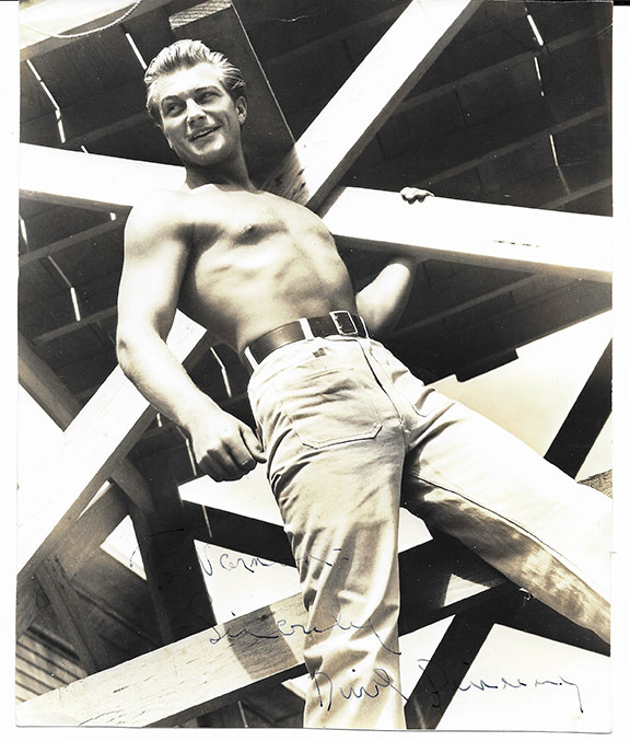 DENNING. Richard (1914-1998). American actor who starred in the science fiction films of the 50’s. Appeared in the Creature of the Black Lagoon, Target Earth, Day the World Ended, The Black Scorpion, Geronimo and Some Like It Hot. He played Lory’s husband on the CBS radio series My Favorite Husband (1948-1951). Handsome vintage 1940’s photograph, 7.5”x9”, B&W, three quarter shirtless pose holding onto a rafter in a construction site. Inscribed and signed: “To Vernon, sincerely, Dick Denning.” In fine condition.........$185.00