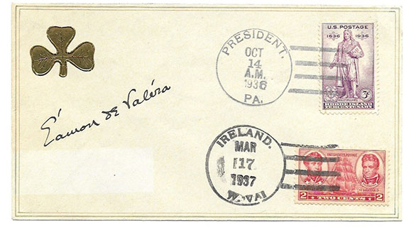 DE VALERA, Eamon (1882-1975). Irish statesman fought for Irish independence from England. President of the Sinn Fein Party (1917-26). Prime Minister Fianna Fail (1926), President (1959-73). Fabulous cover with an embossed 3 leaf clover in gold. Two U.S. Postage stamps, one 3 Cent stamp cancelled “President, PA, Oct.14,1936.” The other is a 2 Cent U.S. postage stamp cancelled “Ireland, Mar 17, 1937.” Boldly hand signed by Eamon de Valera as Prime Minister of Ireland. A very attractive signed cover......................................$175.00