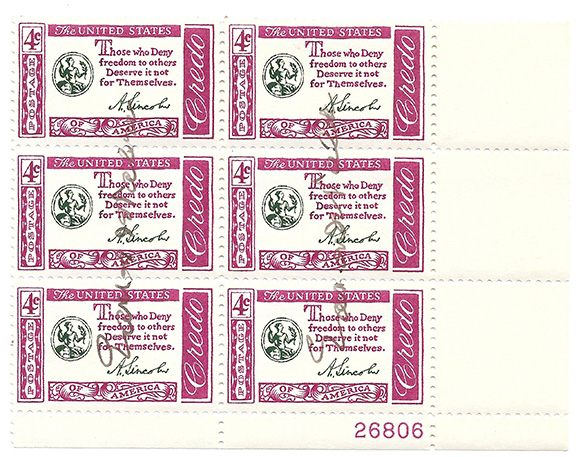 DE VALERA, Eamon (1882-1975). Irish statesman, fought for Irish independence from England. President of the Sinn Fein Party (1917-26). Prime Minister Fianna Fail (1926), President (1959-73). Plate block of six U.S. stamps of a Lincoln Freedom quote. Twice, De Valera has signed these stamps in full. Can easily be separated into two collectibles................SOLD