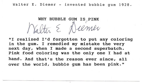 DIEMER, Walter (1904-1998). Diemer worked for the F.H. Fleer Corporation and had worked an experimented on the gum project for over a year. He invented Bubble Gum in 1928. Gum color became pink as it was the only food coloring found in the factory. Three months later there were imitators as Bubble Gum became the worlds biggest selling 1 cent confection. Walter Diemer taught the salesmen how to blow bubbles. Diemer died on his 94th birthday. A Saturday Night live skit joked that his body was found stuck under a movie theatre seat. Collecting classic bubble gum cards is one of the world’s greatest hobbies. In 1933, Goudy Gum Co. was the first to put baseball cards with bubble gum. Topps started in 1950 and in 1952 began to place bubble gum in with the baseball cards. That set contained the Mickey Mantle rookie card. Typed quotation signed on a 3”x5” card. “Why Bubble Gum Is Pink” “I realized I’d forgotten to put any coloring in the gum. I remedied my mistake the very next day, when I made a second super batch. Pink food coloring was the only one I had at hand. And that’s the reason ever since, all over the world, bubble gum has been pink.” Boldly signed in full “Walter E. Diemer.” Simply fantastic..........................SOLD
